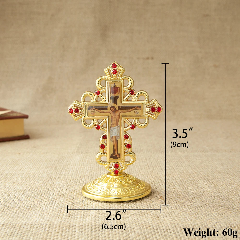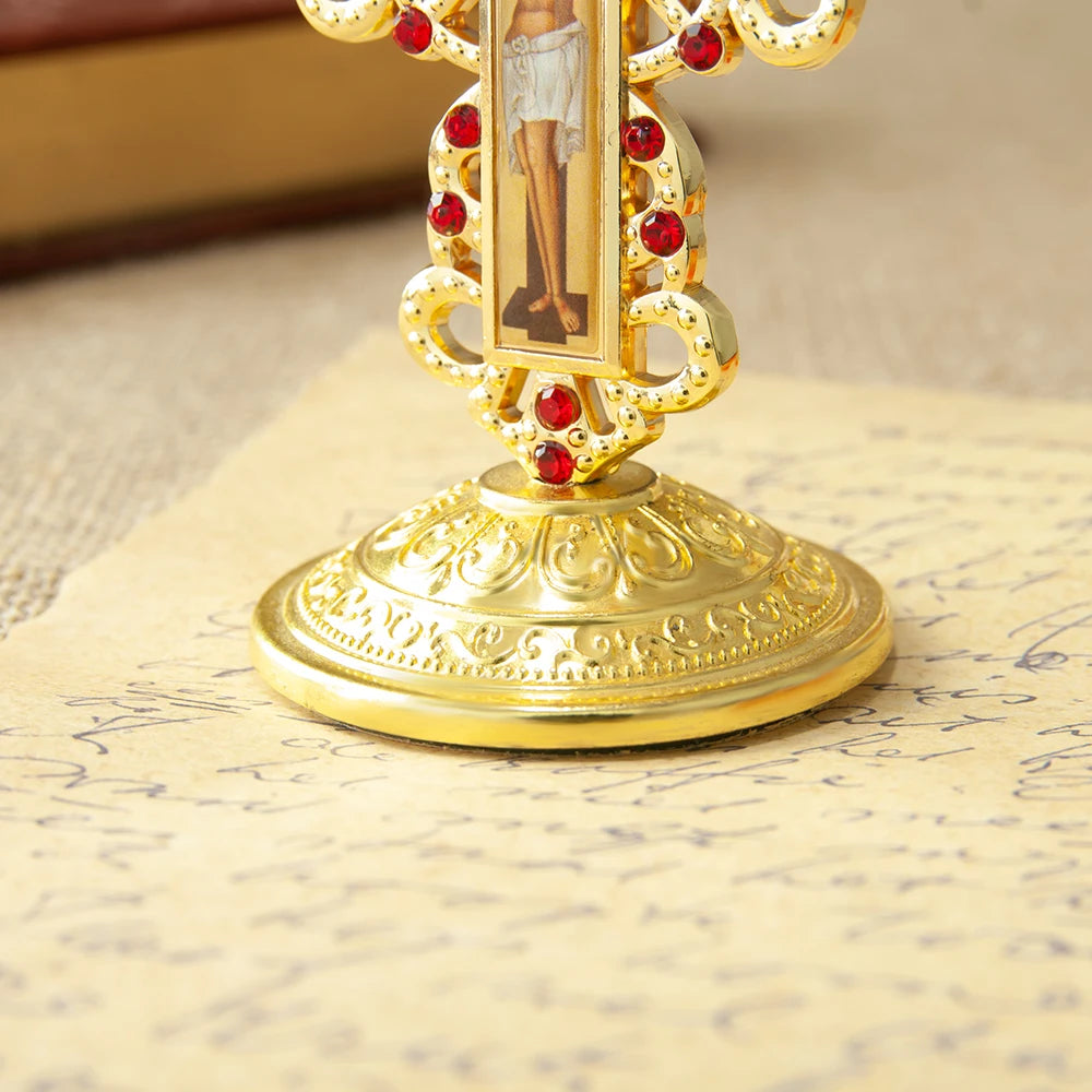 ✝️ Cruz Ortodoxa de Mesa con Base – Icono Metálico de Jesús para Oración y Decoración